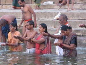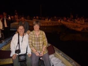 At 5.30 pm we were collected by Prem (todays guide) and taken for our evening boat ride down the Ganges. We were taken in rickshaws to Dasashvamedha Ghat. The journey here got busier and busier first on the rickshaws, then walking down a crowded street and then finally onto the ghat itself. There is only one word to describe this- CRAZY. Crowds of pilgrims, priests, beggars, tourists and not to be left behind -cows. There is loud music and bells coming at you from all angles and you just do not know where to look. The air smells of incense and the feeling is intense.