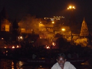 By now it’s getting quite dark and we rowed out and then along the ghats. It’s dark and daunting as we rowed down to one of the cremation ghats. There were 13 fires burning here and that is how many people were being cremated. It’s all a bit of a blur but you could see the wrapped bodies on the bamboo carriers being dipped into the Ganges and then queuing to be burned. The families just leave the bodies after about 3 hours of quietly mourning ( no wailing) and the people employed by the ghats just sweep the remains back into mother Ganges. It is filthy, medieval and dark and I found the size of the wood storage piles completely shocking. We floated our little candles on leaves onto the water and made our way back. We then watched the student priests perform at the D ghat and it did feel like a performance with thousands of people watching as they ‘ohmed’ and swung their incense about.