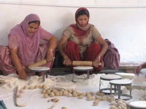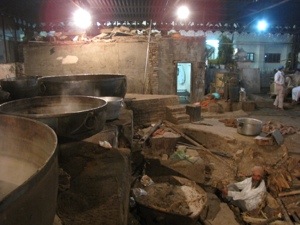 After this we also had a little tour behind the scenes both at night and in the day of the kitchens. We saw where the large group of volunteers were preparing the huge piles of garlic and we saw the giggling man who tended the fires underneath the vast bowls of boiling broth. We also saw the groups of ladies hand rolling the chapatis and Joyce and Enid felt compelled to volunteer here which they did enthusiastically. Then we saw the huge German chapati making machine which could churn them out much faster but they probably don’t taste as good.