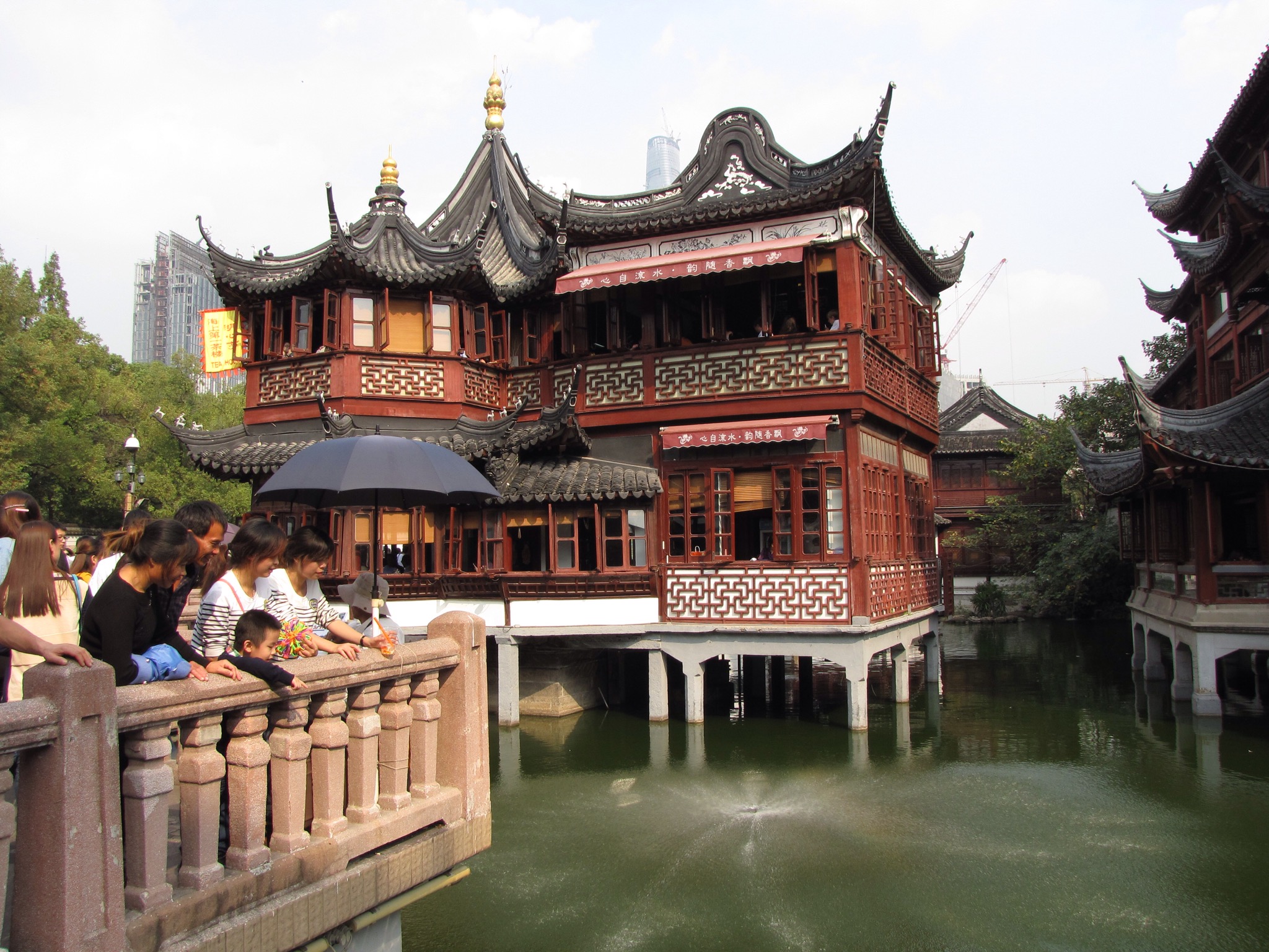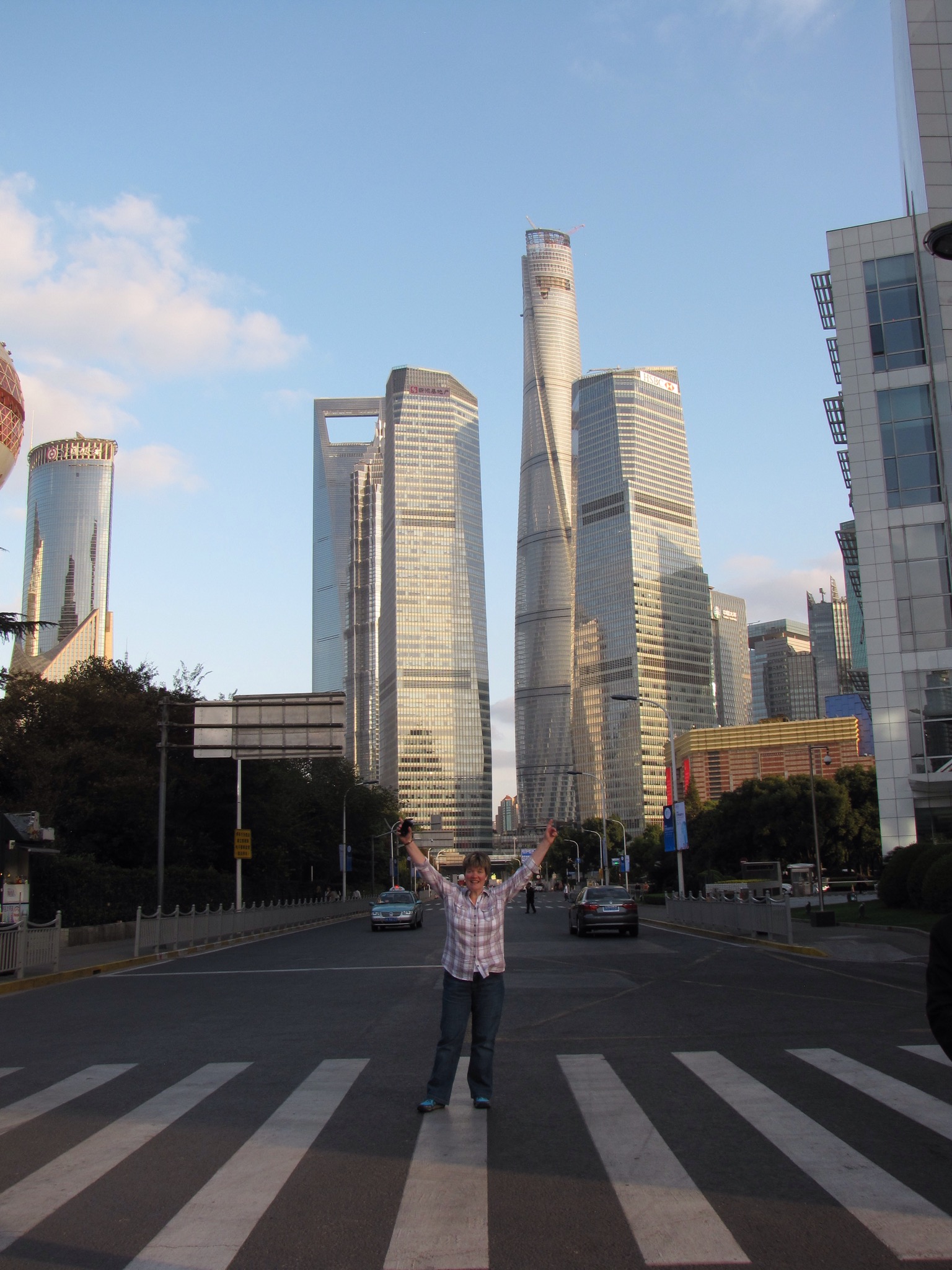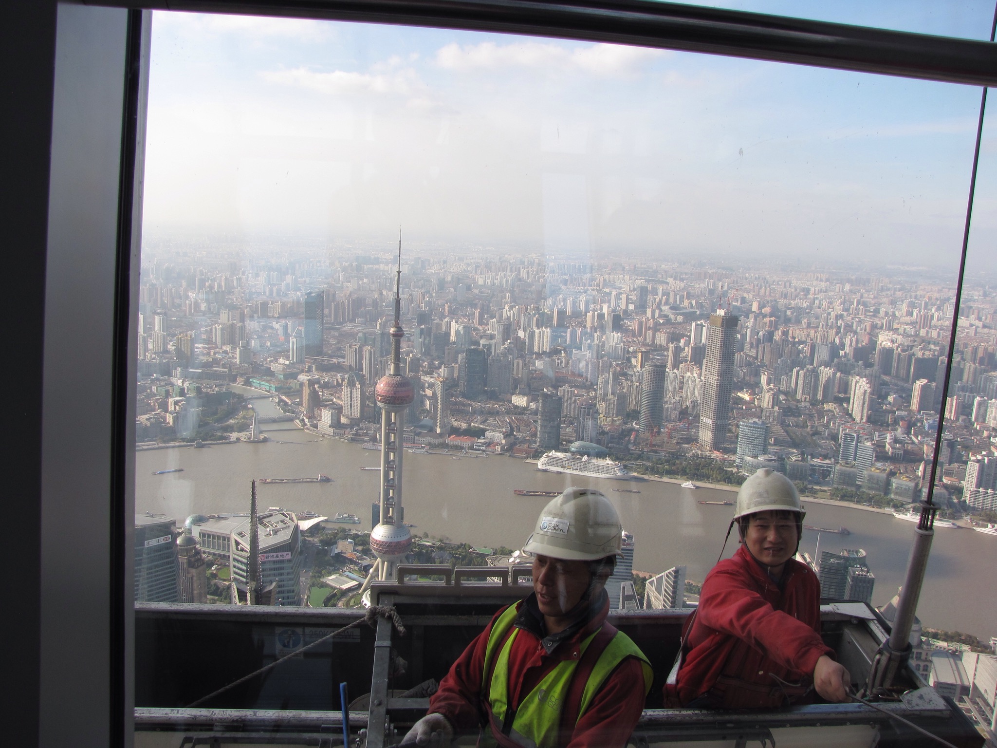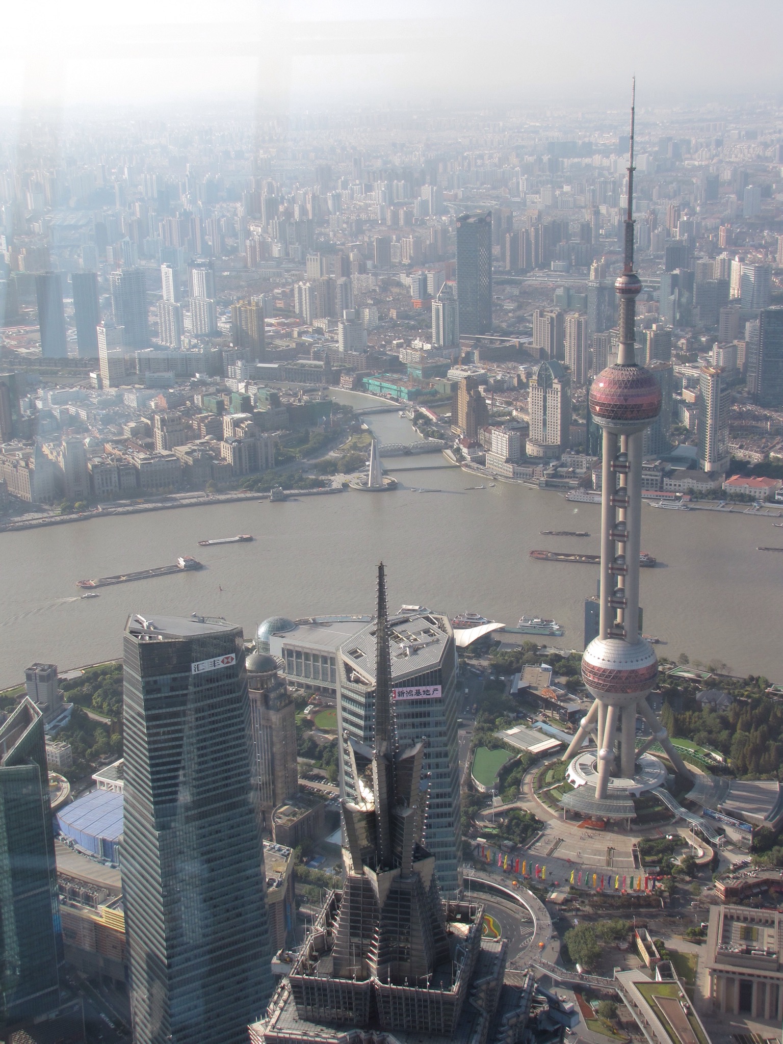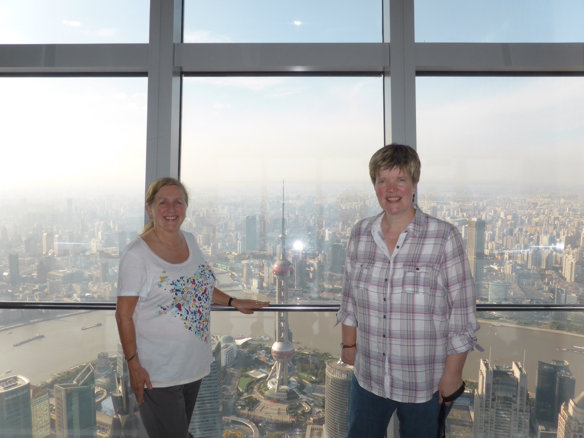 Jane and I opted to go up one of these to admire the views. It is a building with the nickname ‘The Bottle Opener’ because that’s exactly what it looks like and it’s actually the Shanghai World Financial Centre. At 473 metres tall, it is the tallest building in China and the third tallest in the world. It has the highest viewing deck in the world currently and was completed in 2009. It has a tidy 100 floors and we zoomed up there in a lift (not glass thank goodness) in seconds. On the 97th floor we walked across the SkyWalk which has glass floor panels you walk across and through which you can see to the ground below. This was exciting to do although I found myself moving nervously and holding onto window frames when admiring the view!! From up here you could also see another building still under construction. This is the Shanghai Tower and at 632 metres will become the 2nd tallest building in the world. You can also see the really spangly jewel that is the Oriental Pearl TV tower.