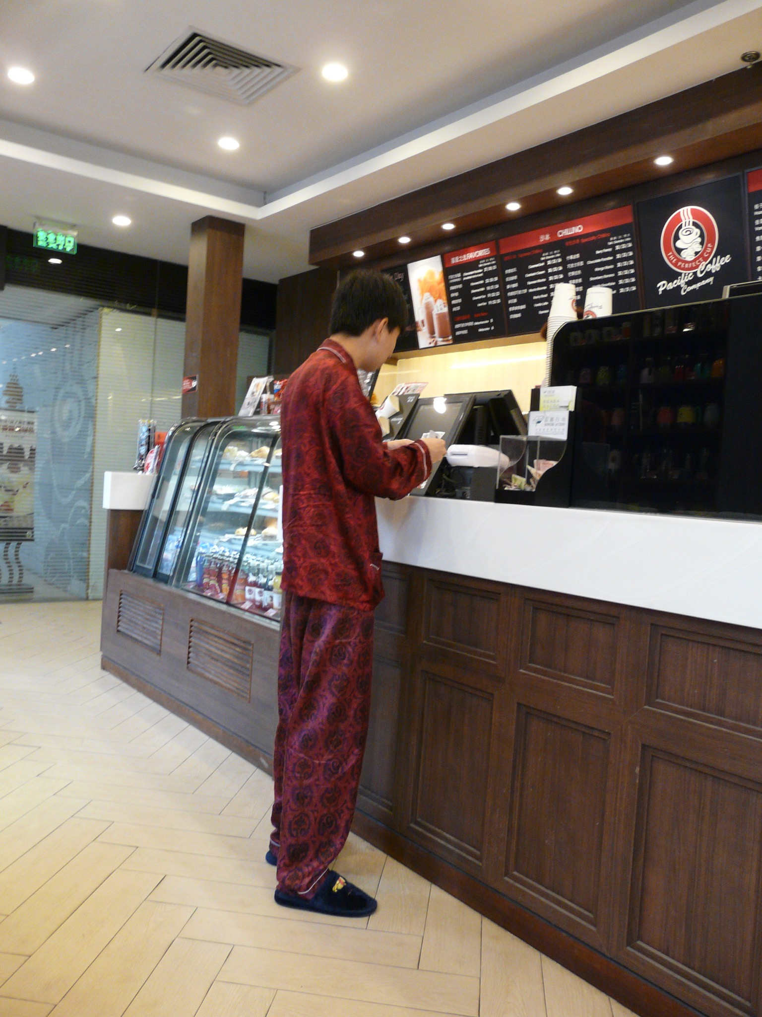 However, my two particular favourite ‘future sightings’ need a bit more explanation. Firstly one day we were having a quick coffee break in a Pacific Coast coffee bar on the Huaihai Street, when in walked a young man with his girlfriend to order a cappuccino. Nothing too unusual there….but this guy was wearing his pyjamas and slippers and I do mean literally his pyjamas not clothes that looked like pyjamas. Where had he come from- presumably one of the apartments nearby but really….is this the future? Luckily, Joyce was clever enough to take a sly photo so you can see this for yourself below.