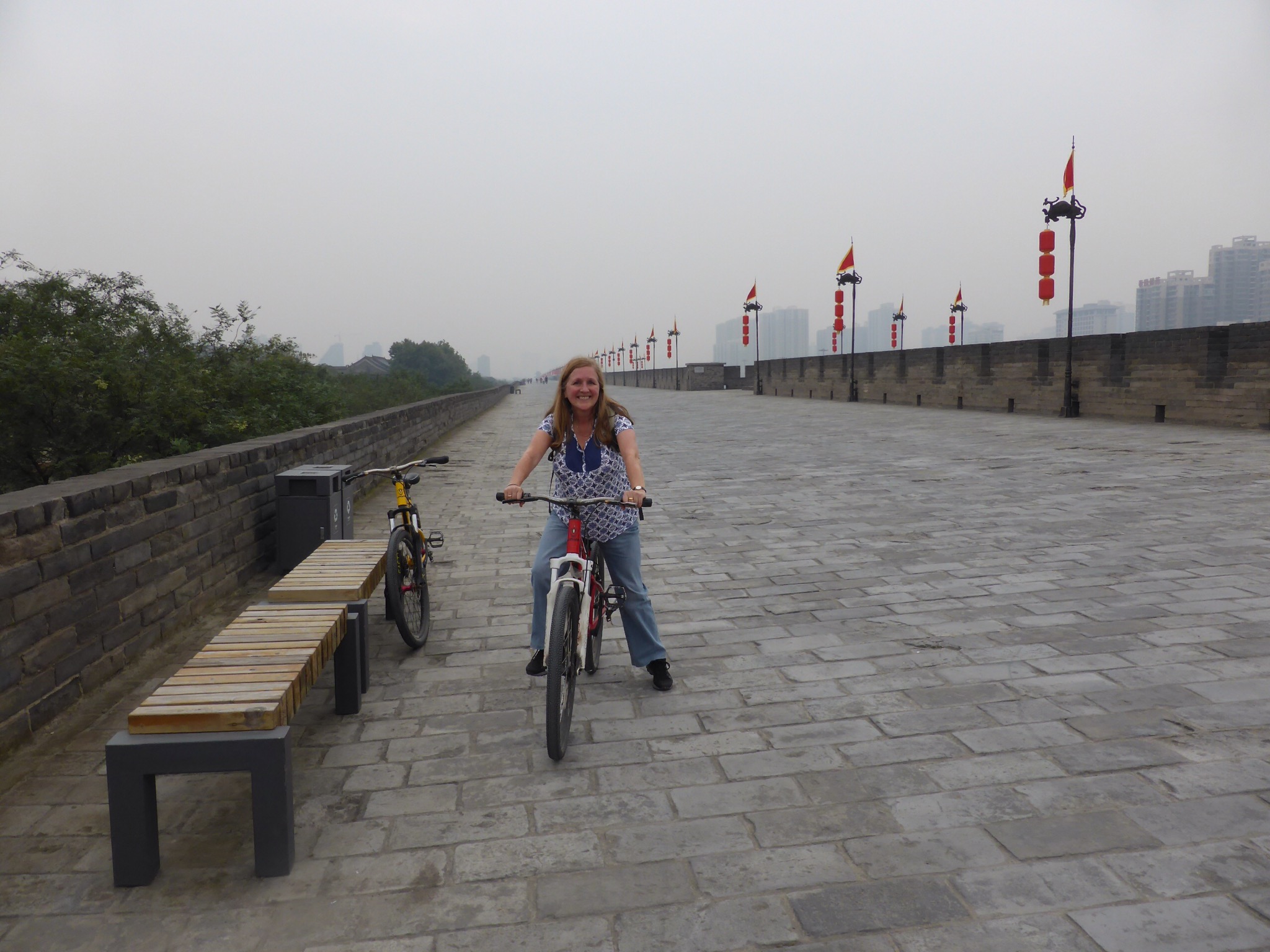 Next stop on our day was back to the city and a tour of the city walls. Ellen explained that there were different options here and we could choose to go around the walls either by foot, on bikes or in a golf buggy. We chose the bikes and after some serious health and safety guidance from Ellen, off we went. The walls are 12 metres high and something like 15 kms in a square all the way round the old city and were built in the Ming Dynasty.