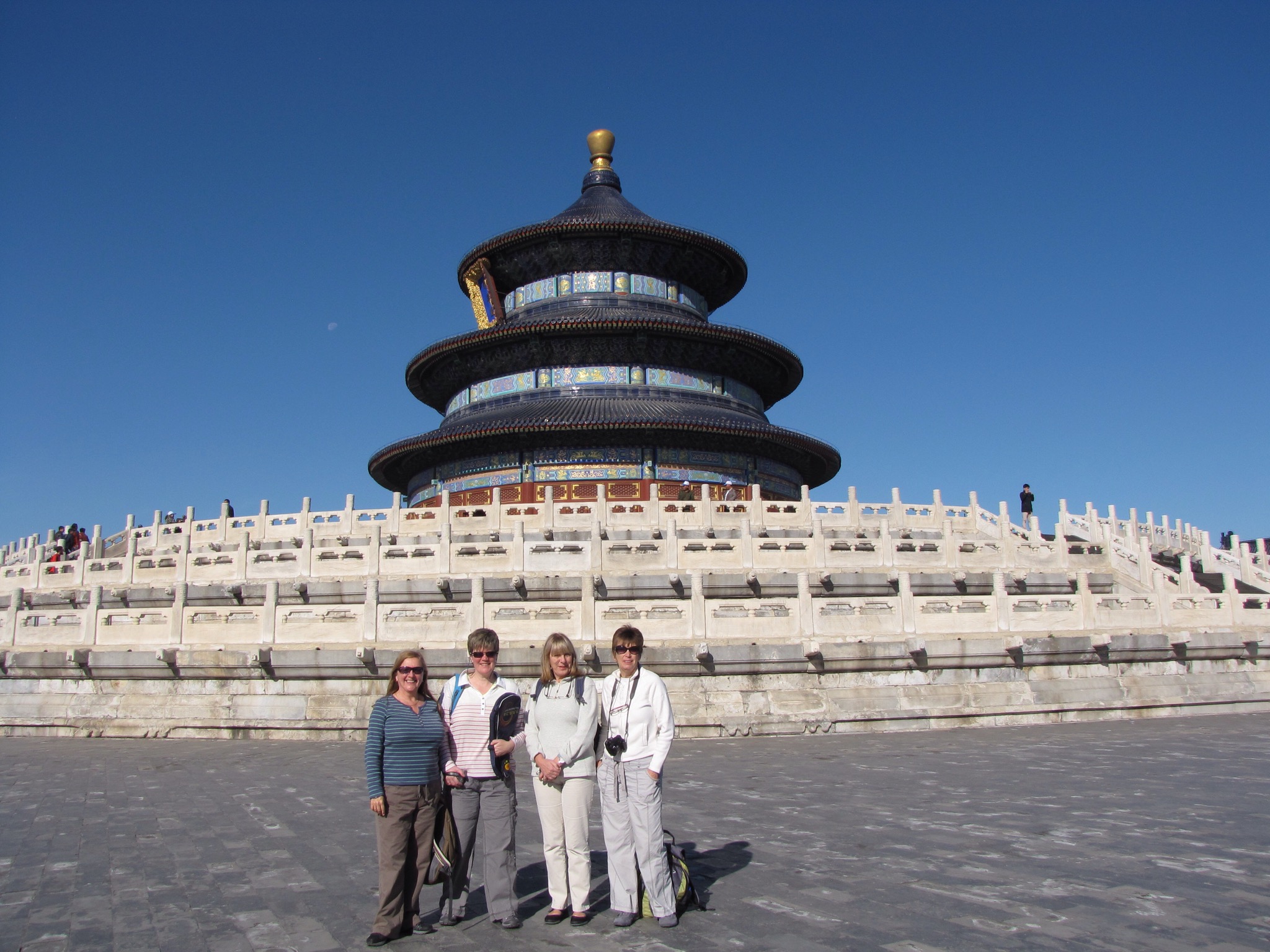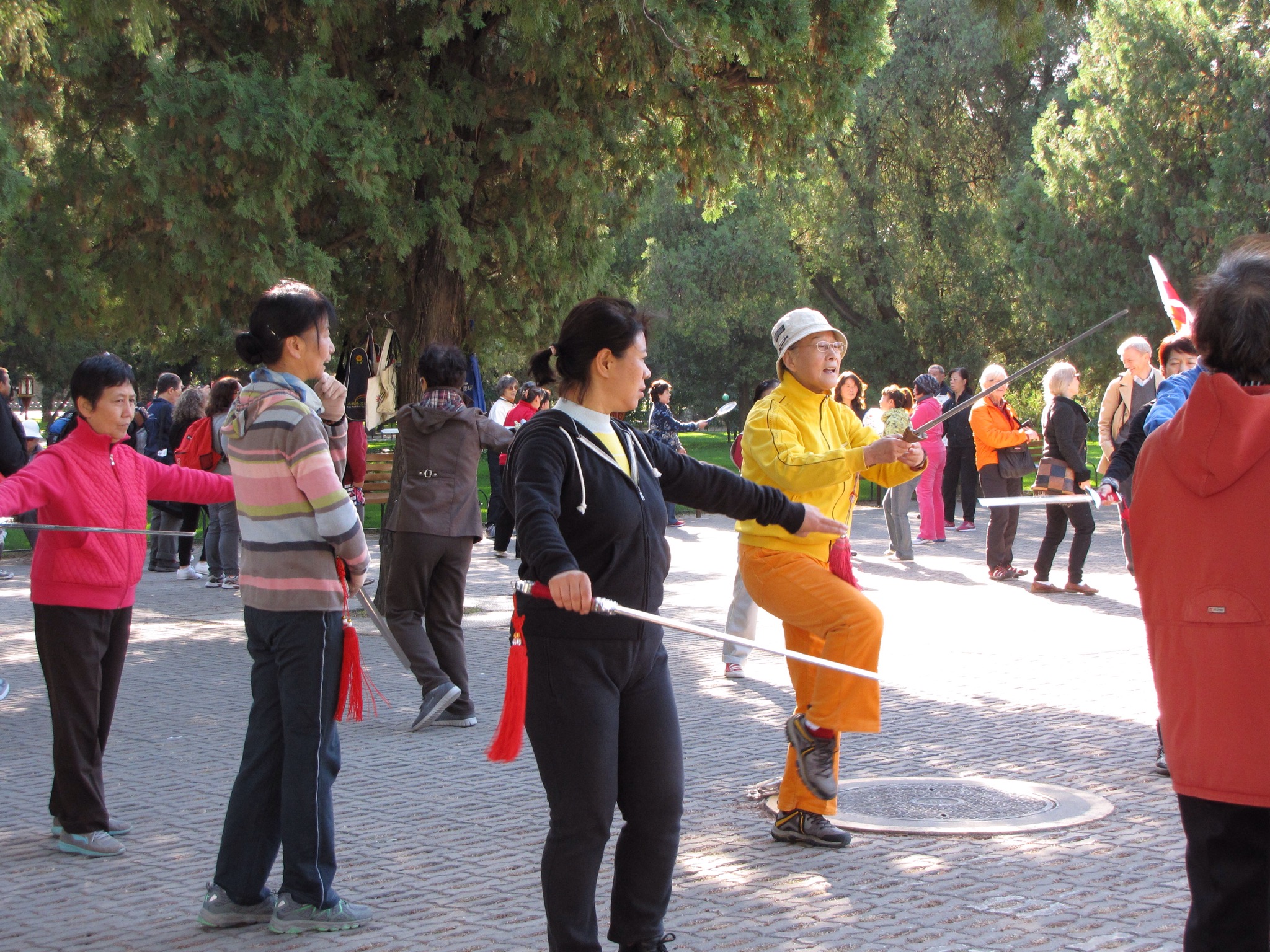 We met up with Yan again and piled into the van. Off we went to the Temple of Heaven where hundreds of people had already gathered to watch some old folk doing their morning exercise classes in the shade of the trees. Actually it was all rather civilised as different groups of people practiced traditional tai chi, sword tai chi, ball tai chi and our favourite badminton racquet and two ball tai chi. Jane was convinced to join in and enjoyed it so much that we actually purchased our own set. Then we walked up to the Temple itself where it turned out all the people hanging about weren’t actually queuing to get in, they were really just there for the social. They were playing cards and dominoes and some of the women had their own knitting circle.