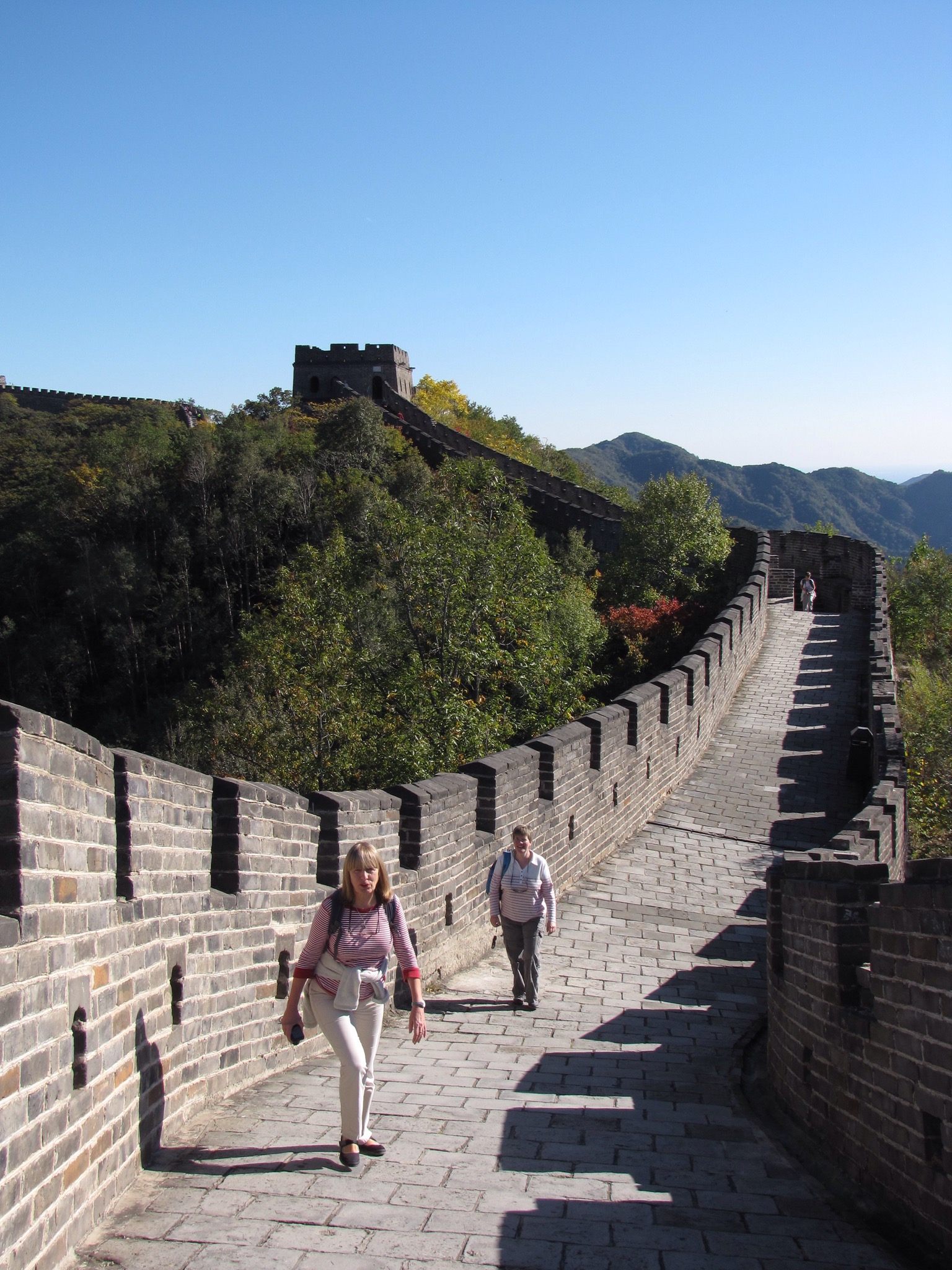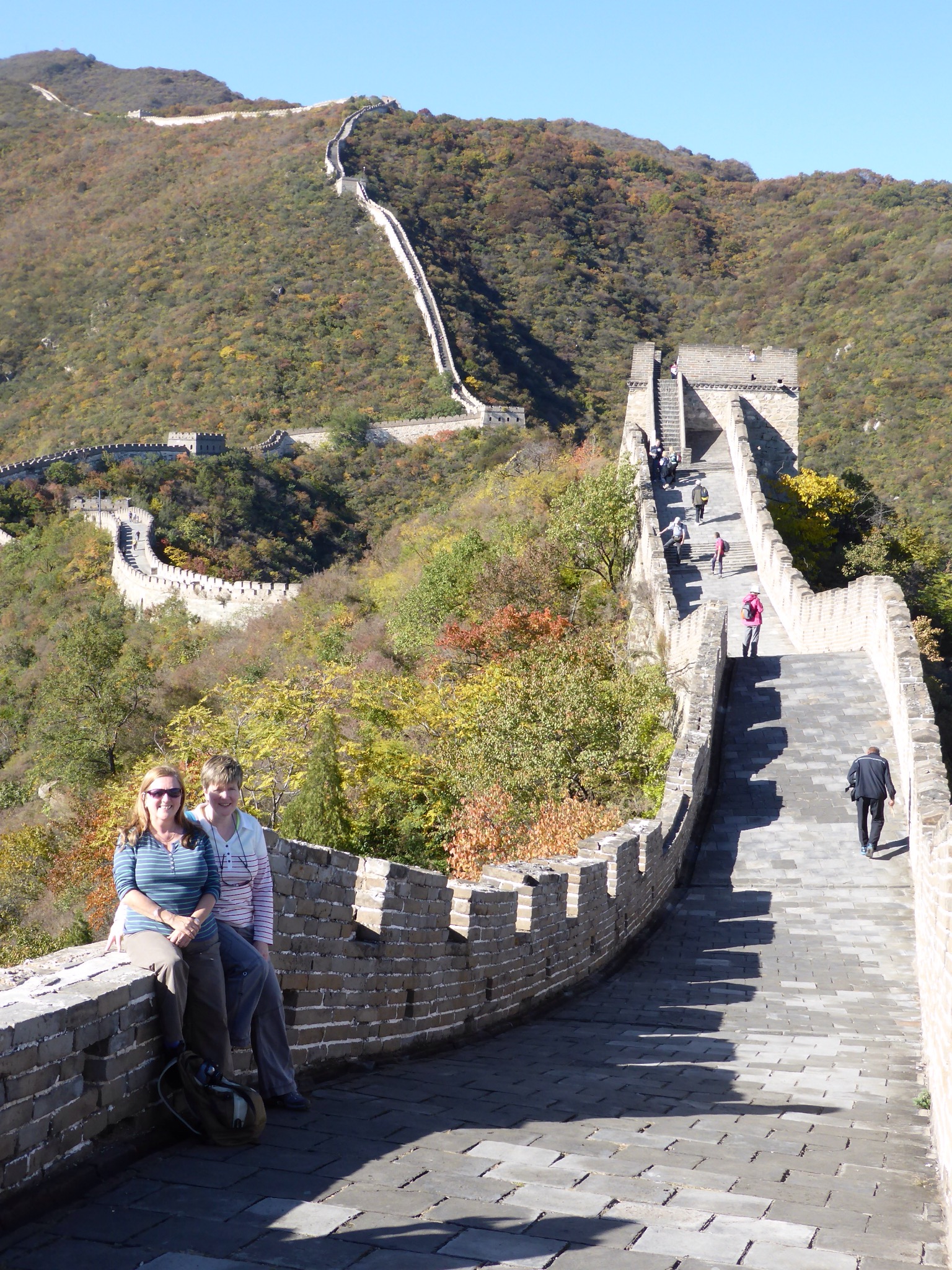 After this there was a bit of a change in our itinerary and we drove all the way out to the Great Wall of China. This took about an hour and a half during which time we all fell asleep in the van. We drove to a section of the wall called Mutianyu. This really was in a most attractive area with mountains silhouetted all around. Even so it had something of a theme park feel to it -having to catch a shuttle bus to the cable car to then get up onto the wall itself. Mind you we were glad of it as our poor bones ached from all that walking the day before. Pathetic old folk.