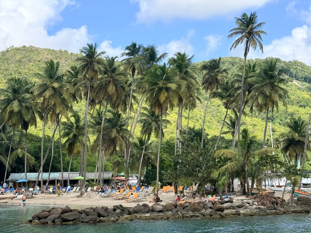 On our way back we took a little detour into Marigot Bay. This was an absolutely stunning inlet with deep emerald green waters, white sand coves with colourful saily boats and skinny palm trees. Wow…now here’s a place we could return to!