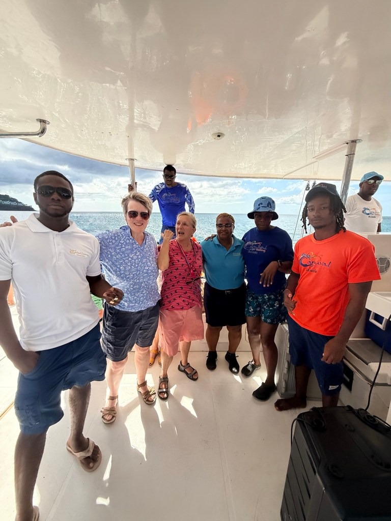 I had a good nights sleep again but we had to be up at 6-30am and by the time we went to breakfast we’d already docked in Castries, St Lucia. Our trip today was a 6 hours trip on a catamaran to Pigeon Island and then the famous Pitons. This would be another big bucket list tick for me. There was a bit of phaffing about whilst they got us organised and then we just walked a short distance along the dock to our beautiful, huge catamaran called Carnival of the Seas. On board there was plenty of space for the 50 or so people taking the trip and we wisely chose to sit in the shade. The crew were introduced by Samantha the tour guide and they were all lovely and friendly and helpful all day.