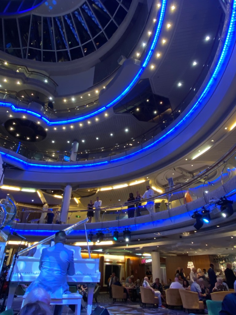 In the evening it was the ‘Dress to Impress’ night so we did get all dressed up and gathered in the Atrium to watch the Captain introduce his crew leads. We met up with Jo and Shami and had dinner in the formal main dining area. We had a lovely evening getting to know them and as they are now our new best friends, we finished the evening off by going to the Silent Disco….but that’s another story….