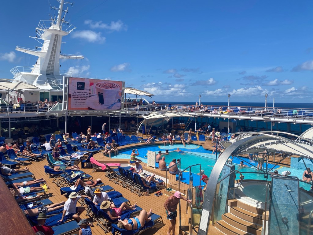 After this we joined the total gridlock on the way back to the port. We boarded the ship and spent the afternoon on the pool deck. I’m not a fan…it’s too busy and too noisy but at least we got sun beds (there are plenty) and discovered the indoor pool in the Glass House. This is a lovely cool and refreshing pool and very quiet. Hurrah.