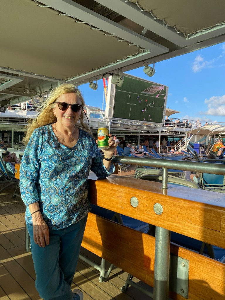 After lunch we were able to stay on the deck on a couple of sunbeds and spent the afternoon in the partial sunshine and I enjoyed a couple more swims in the pool and sea. Lovely. At 4-30pm Brenda was waiting for us as promised and again carefully drove us back to the port. She’d been absolutely brilliant as everyone had told us the taxi drivers here are.